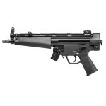 H&K SP5 9mm Luger 8.86in Matte Black Modern Sporting Pistol – 10+1 Rounds – The SP5 was developed by Heckler & Koch as a semiautomatic, civilian sporting pistol that matches the look and feel of the legendary MP5 submachine gun. Designed and manufactured to meet the definition of a civilian pistol, the SP5 is loaded with authentic features, like a Navy barrel with threaded tri-lug adaptor, paddle magazine release, and fluted chamber. The backbone of the pistol is the roller-delayed blowback operating system, which is legendary for its accuracy, reliability, and smooth shooting dynamic. It retains many of the critical elements of the MP5, including its precision-machined components and attention to detail. For more comfortable shooting, the SP5 is equipped with an elastic “bungee” sling. The sling is easily installed by snapping it onto the sling swivel hardware located on the rear of the receiver. Using the sling makes firing the SP5 more stable and reduces fatigue.